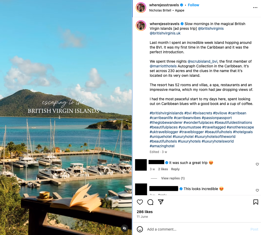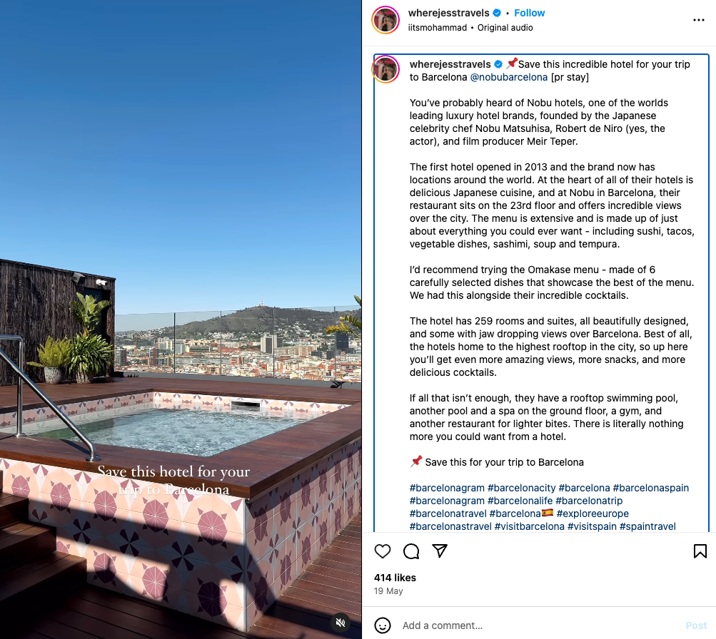 Numerous travel bloggers and influencers are available for hotels to collaborate with. For example, Jess Inions (Instagram—@wherejesstravels) frequently partners with hotels and travel brands, documenting her journeys. Her posts are informative and educational, and they consistently maintain a visually appealing aesthetic.