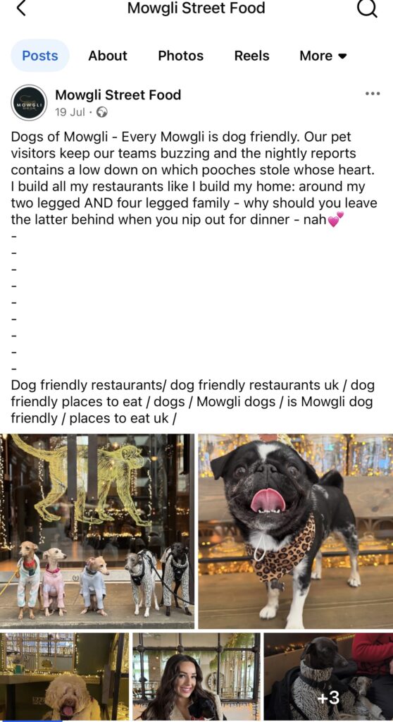 - On Facebook, where they have 33k followers, they post content similar to Instagram but with more community-driven themes like “Mowgli through your eyes” or “The dogs of Mowgli.”